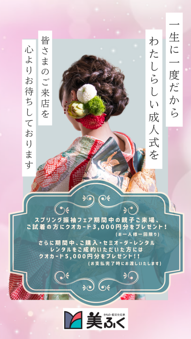 ◇さらに振袖お買い上げ、セミオーダーレンタル、レンタルご成約の方にはクオカード5,000円分をプレゼント‼(お支払いが完了時にお渡しいたします。)