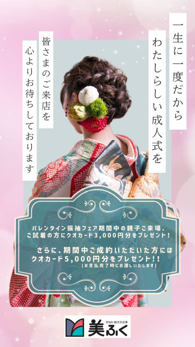 ◇さらに振袖お買い上げ、セミオーダーレンタル、レンタルご成約の方にはクオカード5,000円分をプレゼント‼(お支払いが完了時にお渡しいたします。)